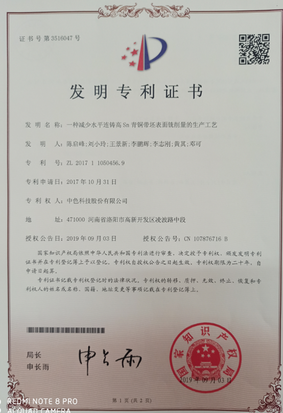 专利技术简介:一种减少水平连铸高Sn青铜带坯表面铣削量的生产工艺,其将预热后的干燥覆盖剂装入熔炼炉,然后熔炼炉加热至550~600℃,依次加入锌、紫铜,再二次升温至750~800℃,加入中间合金磷铜,再依次加入锡、铅,升温至1180~1240℃,然后静置5~10min,然后采用高电压低电流电磁震荡辅助铸造,交流磁场频率为5~10MHz,使带坯凝壳与结晶器石墨模壁脱离接触,最后采用热风循环强对流退火,保温。本发明有效降低了高Sn青铜带坯表面偏析、气孔、裂纹等缺陷层厚度,减少表面机械铣削量,提高了成品率,降低了生产成本,实现了节能降耗和环保。